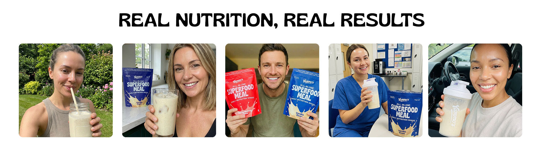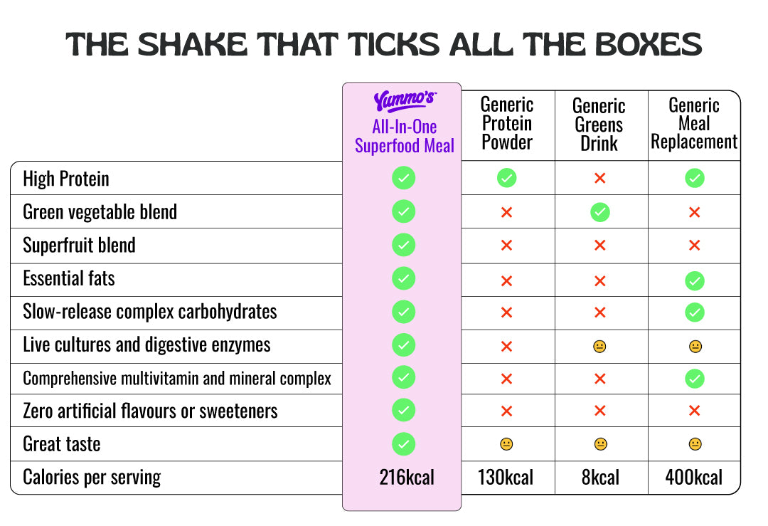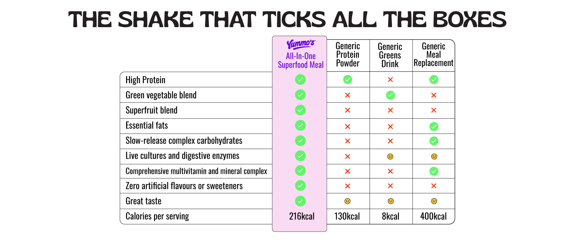 Bursting with good stuff, Yummo’s All-In-One Superfood Meal shakes are a delicious, convenient way to fill nutritional gaps. Each shake is packed with the essential nutrients you need to thrive. We’re talking clean plant protein, leafy greens, real fruit and vegetables, live cultures, essential fats, gut-friendly fibre, antioxidants, digestive enzymes, electrolytes and a full spectrum of vitamins and minerals.