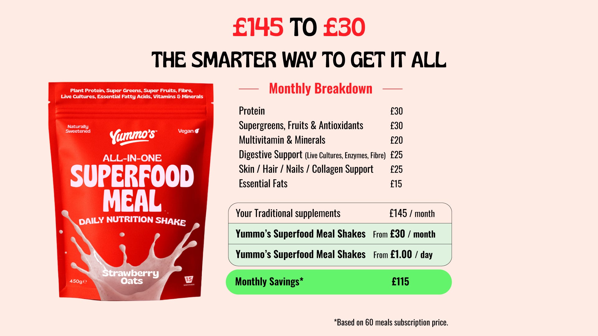 💰Great Value. Our Superfood shakes replace a shelf’s worth of supplements — in one shake, for a fraction of the cost.